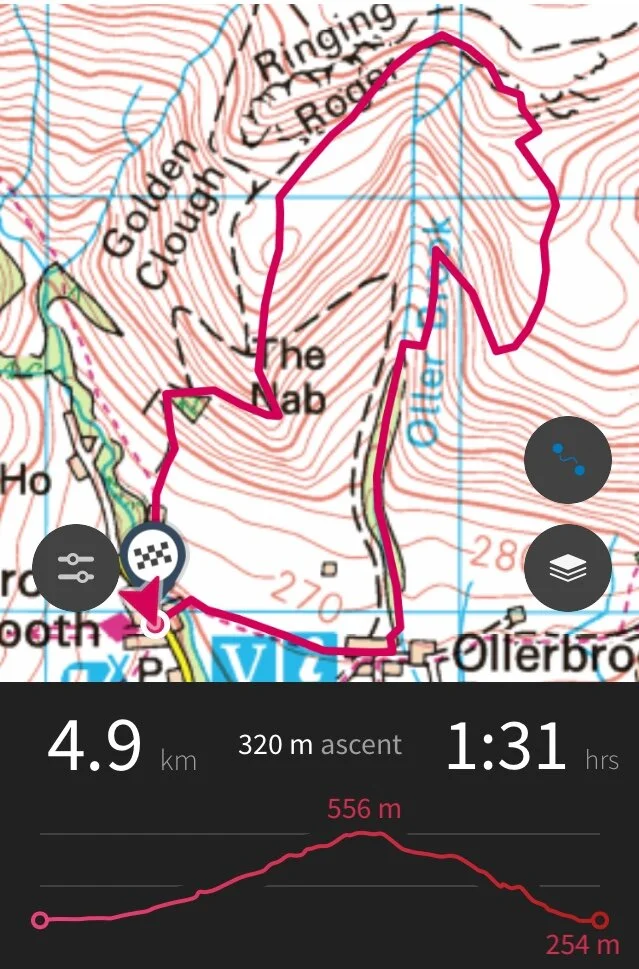 Walk up Oller Brook and cross over the stream. Follow the track above the stream, turn sharp right on the track then left onto grassy paths, climbing all the way. You won’t see many people going up the zig-zag path onto Kinder (a favourite, lovely). Then a quick few hundred metres along the edge path before descending. ‘Off piste’ again on the vague spur to The Nab, then straight down the ridge to the wall. Back to civilisation and the village